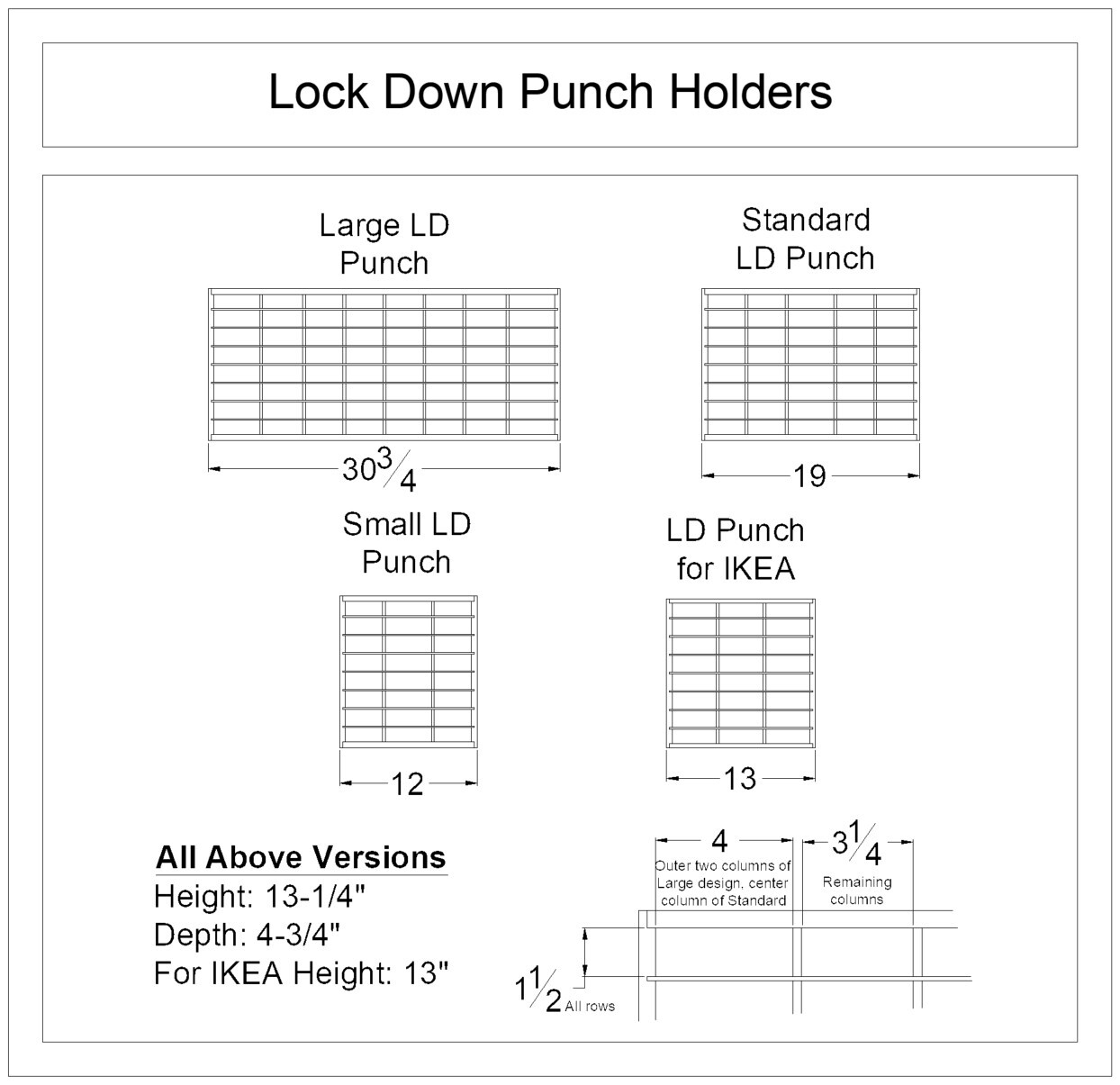 I like the idea for this product, but I wish there was a product for each size lock down punch. I thought the large punch would fit but I loose 2 rows because they don't fit.