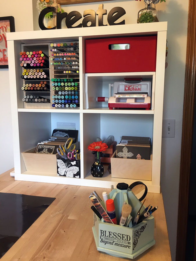 On top of the desk for easy reach is a small IKEA® Kallax that holds Kathy's Stamp-n-Storage Marker Nook, Side-by-Side Marker Holder and her Magnet Cards in Creative Crates.