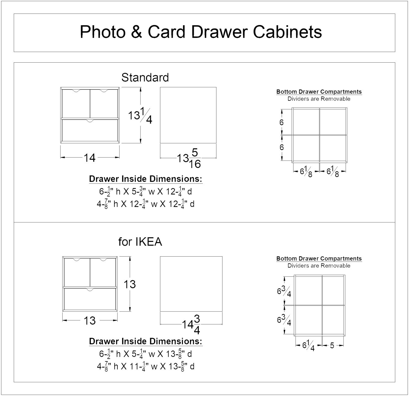 It is important to understand the difference between the Standard vs. IKEA option. The IKEA® option is 13" wide. This means the bottom drawer holds your photos a little different in order to fit inside your IKEA® cube. Please refer to the image below.